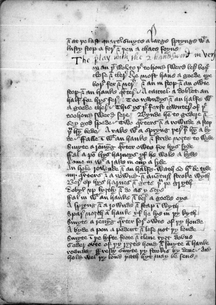 [T]he .7. cowntr ys menyd wt .iij. menyd foyns & tra-spose ha- boþe goyng & comyng . & smyte þy foynys wt in þy sengyl quartr smyte a . & at þe last quartr . smyte a large sprynge wt a lusty stop a fore & þen a chace foyne//