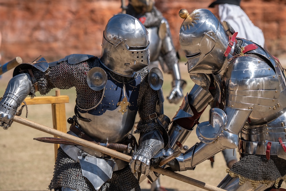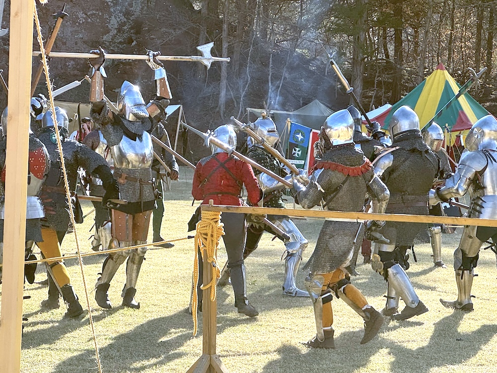 Whether judicial trial by combat, a chivalric duel, or a deed of arms, the pollaxe was the primary weapon of choice between armoured men. By the fifteen century, the sword and dagger were considered secondary weapons, only capable of causing harm to an opponent by exploiting the small gaps in his plate armour. The pollaxe was essentially an axe, hammer, and spear affixed atop a sturdy shaft about the height of its wielder.