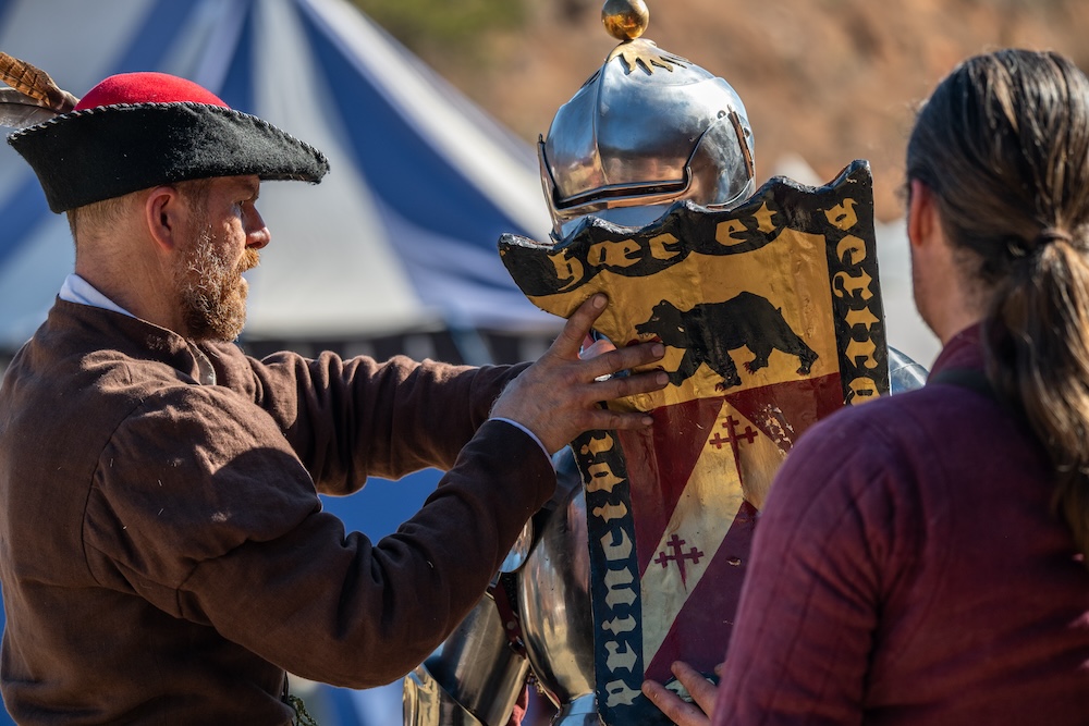 - Joust á Plaisance - Jousts of peace utilized tilt barriers to separate the competitors who wore specialized armour and employed lances tipped with coronels. The wore specialized armour. The helm was strapped down to the brigandine or cuirass which was fitted with a lance rest; a manifer guarded the left hand and forearm; on the right hand, the rider wore a glove, likely of leather, known as a gaignepain, a poldermitton protected the inner elbow of the right arm; a besagew, or large circular plate, covered the armpit below the laminated right pauldron; a pear-shaped buffer of wood, called a la Guerre, was attached to the left breast behind the wooden shield, which was covered with square pieces of horn and attached by a cord.